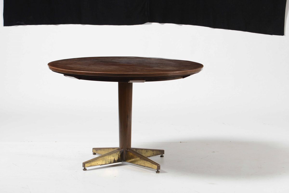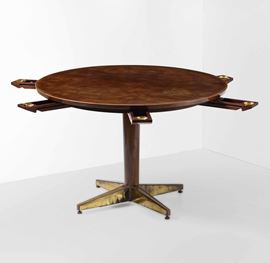 Tavolo da gioco con struttura in legno, posaceneri estraibili, base e particolari in ottone, piano in legno.
