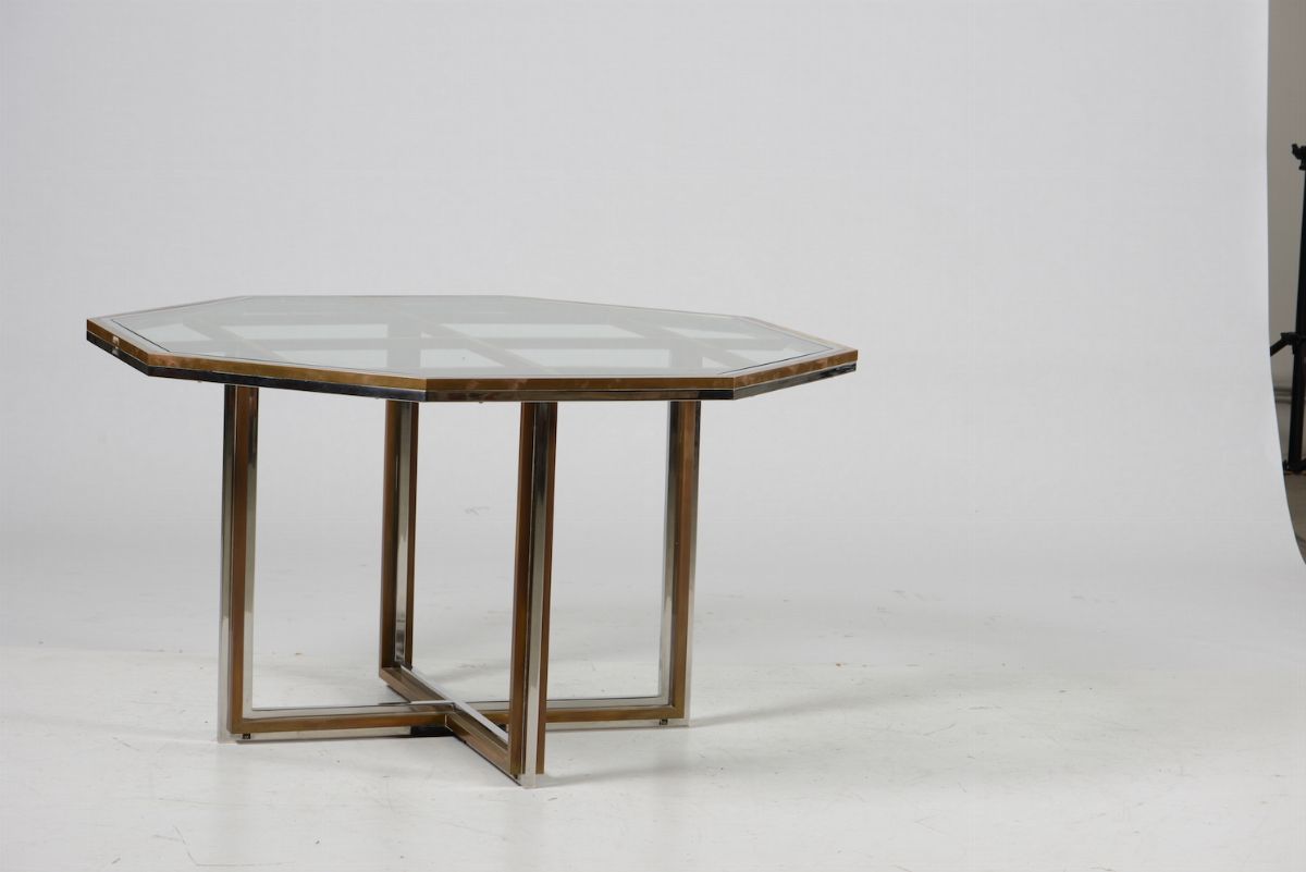 Tavolo ottagonale e quattro sedie con struttura in metallo cromato e ottone, rivestimento in tessuto e piano in cristallo [..]