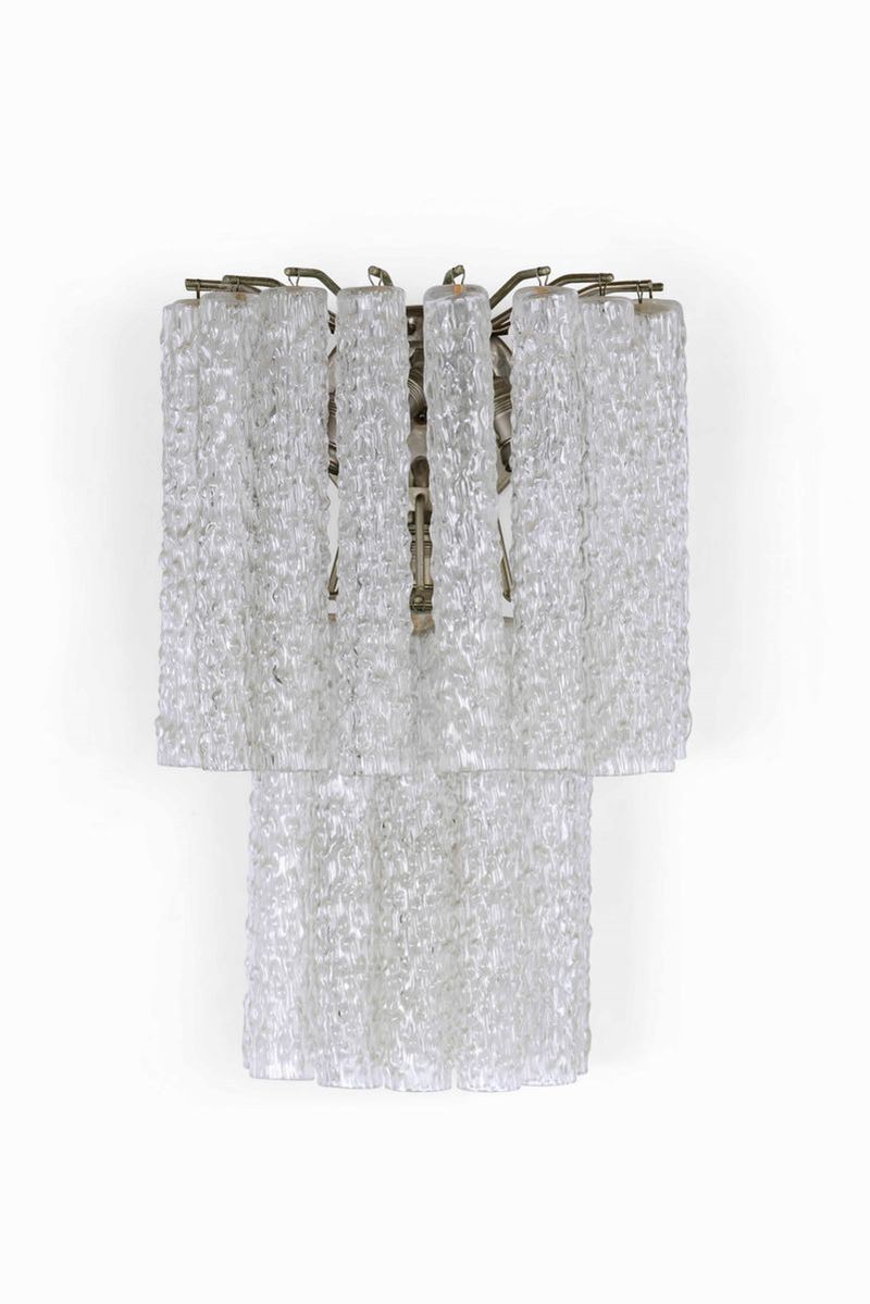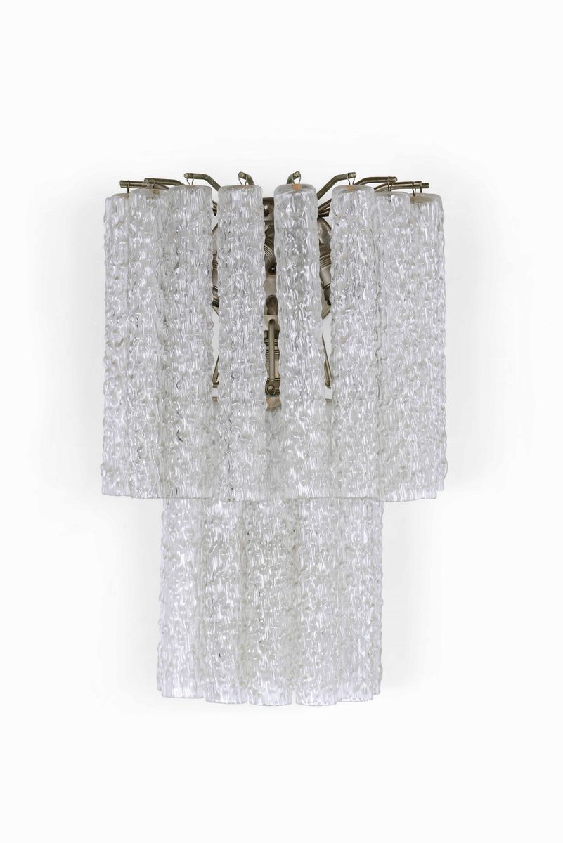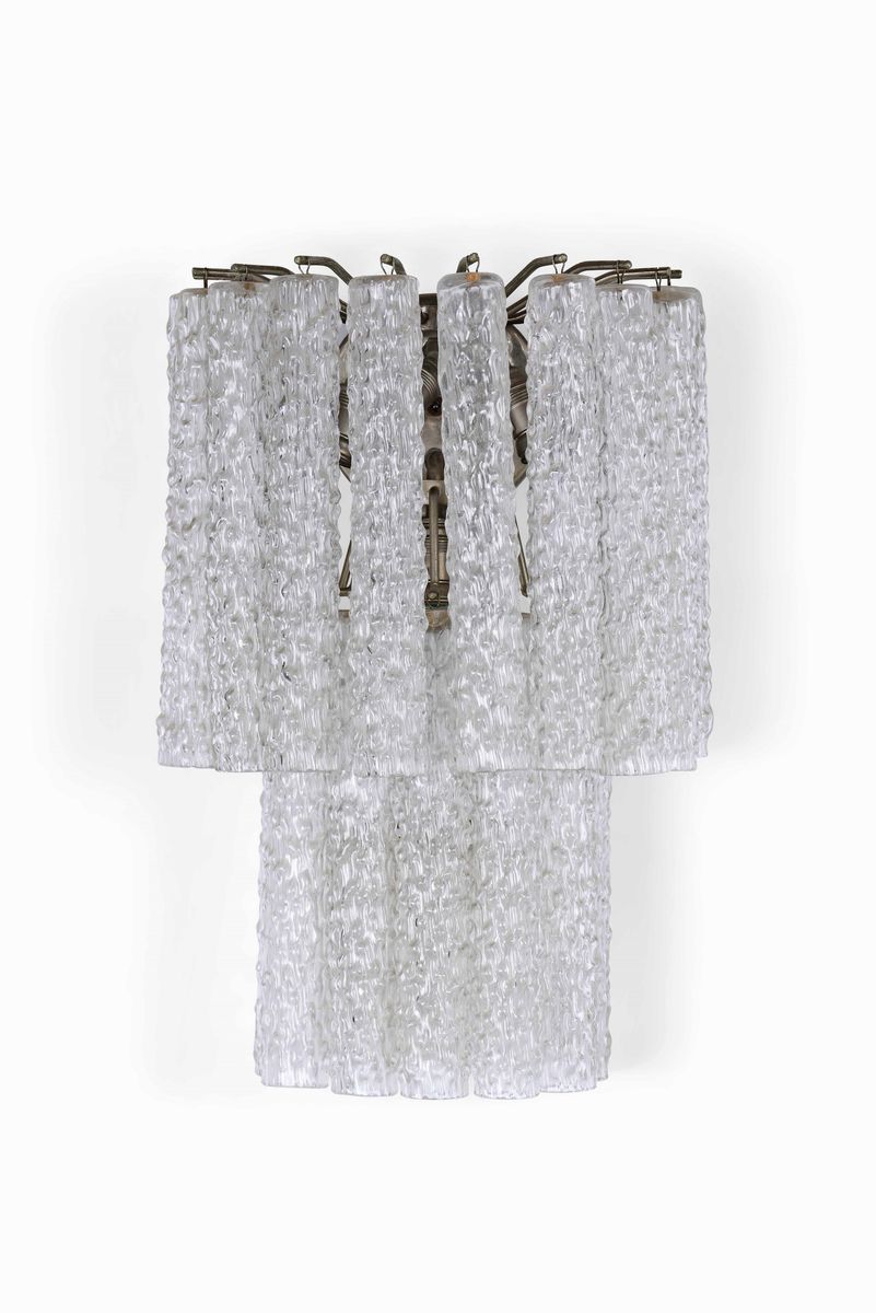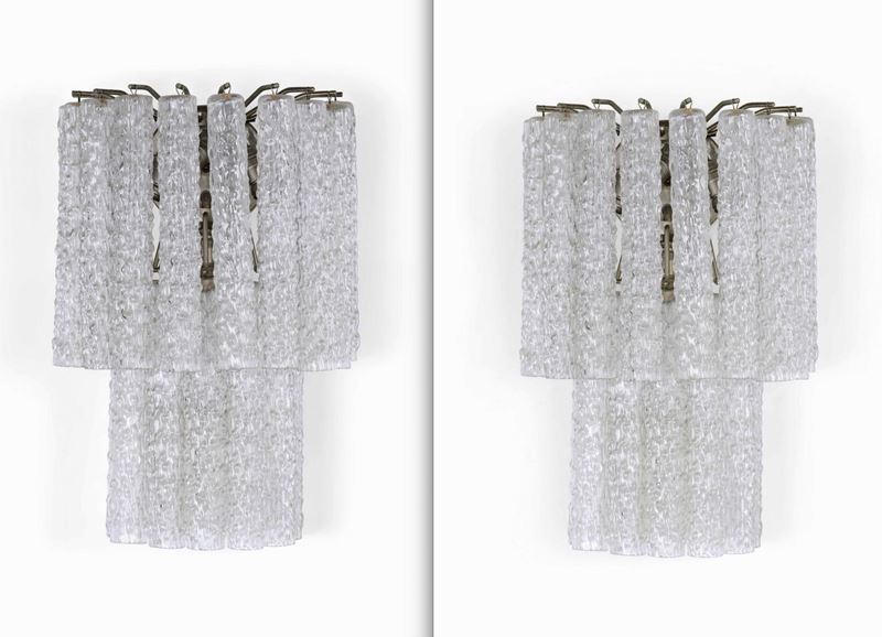 Due lampade a parete con struttura in metallo e diffusori in vetro di Murano.