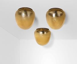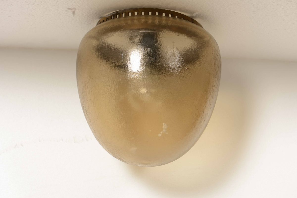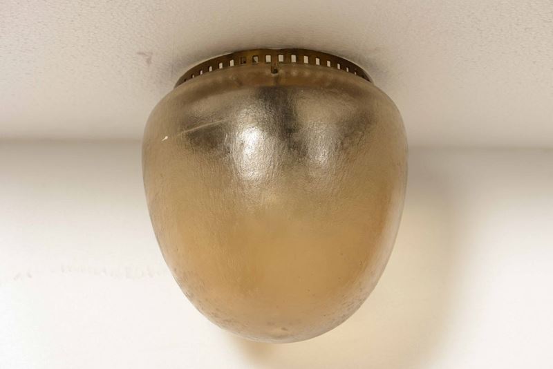 Tre plafoniere con struttura in metallo e diffusore in vetro di Murano acidato.