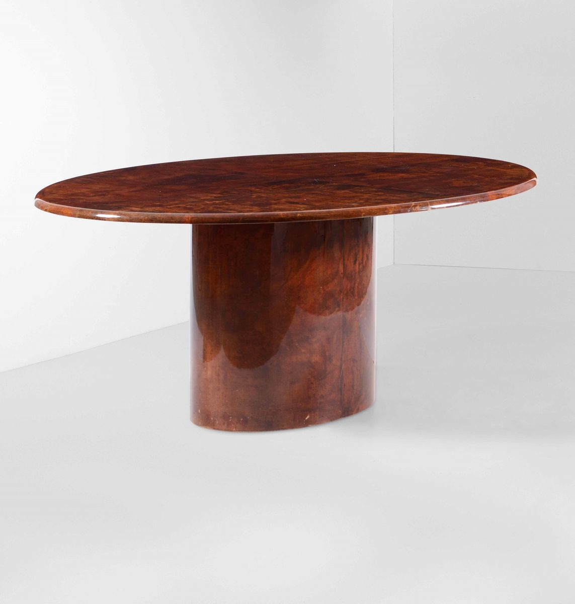 Tavolo ovale con struttura in legno e rivestimento in pergamena colorata.