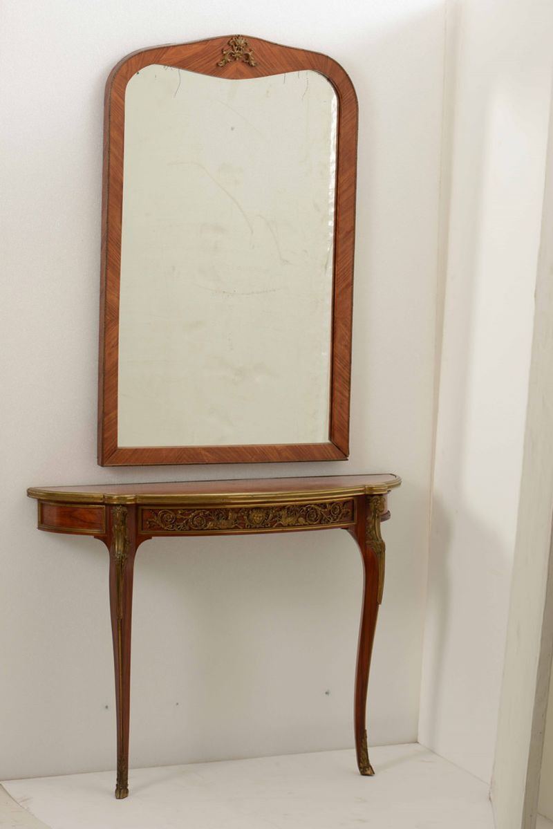 Coppia di consoles a mezza luna in bois de rose e finimenti in metallo cesellato unite a coppia di specchiere en suite. Francia, stile '700, XX secolo