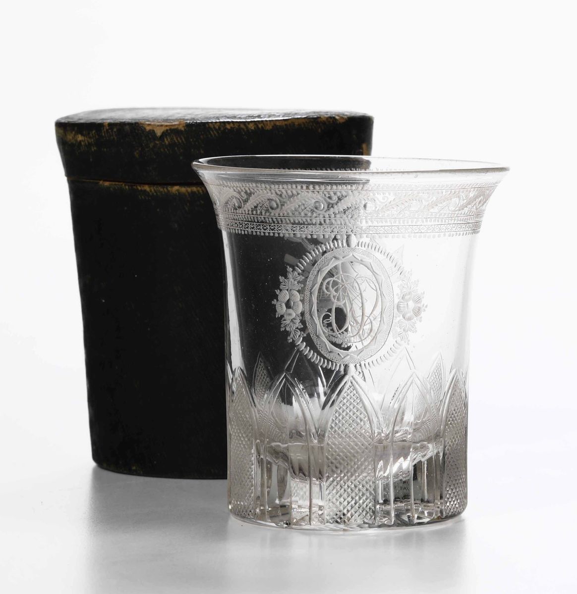 Gobelet “Monogramme” in cristallo molato ed inciso, Francia, prima metà del XIX sec. Decorato finemente sul retro con un trofeo musicale.