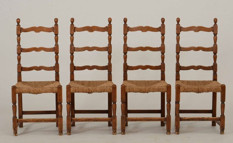 Gruppo di sei sedie e una poltrona a dondolo