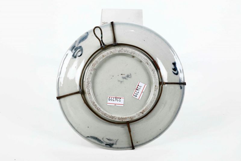 Piattino in porcellana blu e bianca con decori stilizzati. Cina meridionale, XVIII secolo