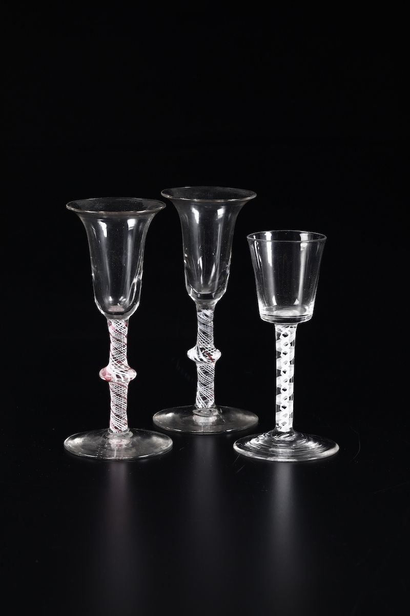 Tre bicchieri a calice Vetro soffiato con stelo a spirali bianche e rosso rubino Inghilterra o Europa centrale XVIII-XIX secolo