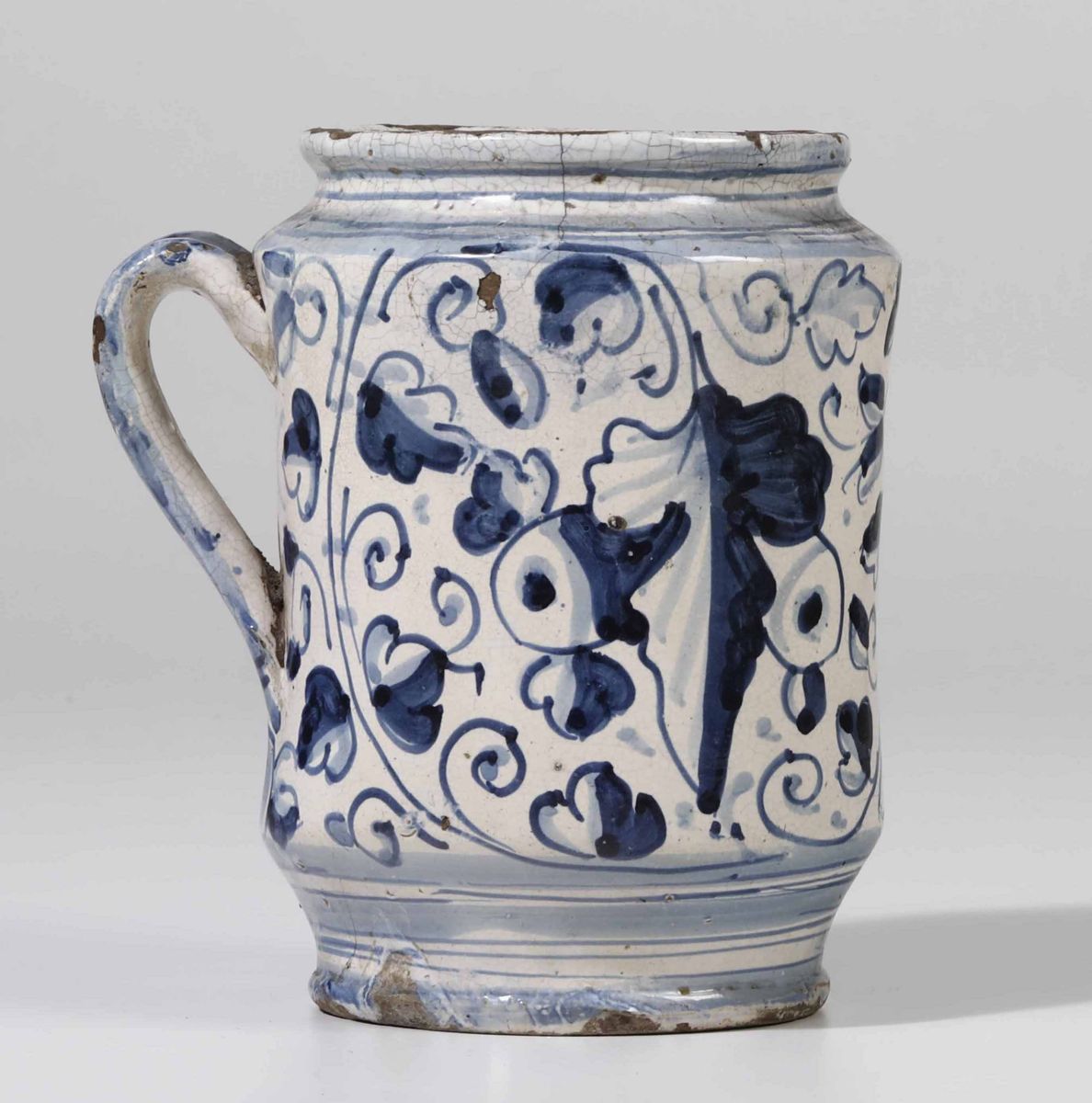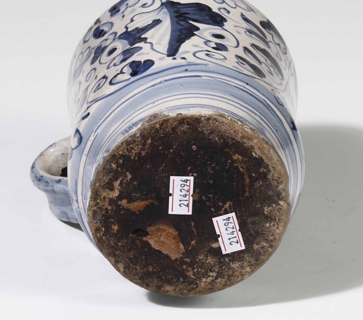 Albarello dal corpo cilindrico con un’ansa laterale, rivestimento di smalto stannifero, decorato in monocromia blu di cobalto, col motivo a foglia di prezzemolo, a stesura rapida. Troviamo lo stesso ornato corsivo su pezzi montelupini, vedi F. Berti, Storia della ceramica di Montelupo – Uomini e fornaci in un centro di produzione dal XIV al XVIII secolo, v. I, Montelupo Fiorentino 1997, p.369, n. 296-298