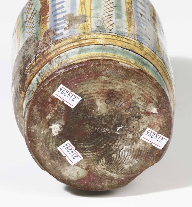 Maiolica policroma. Altezza cm 22. Conservazione: sbeccature ai bordi; inferiormente cadute di smalto