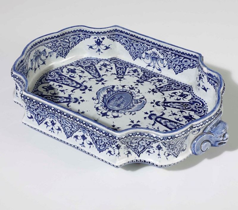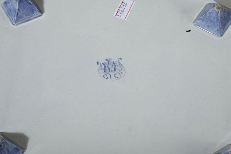Maiolica monocroma in blu. Marca: tre torri e Gien in blu. Dimensioni: altezza cm 8; cm 34x23. Conservazione: ottima.