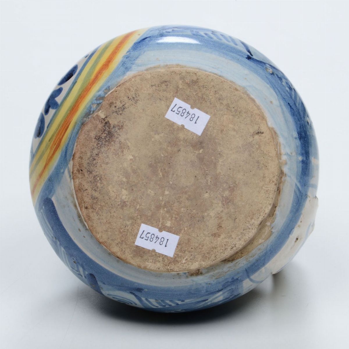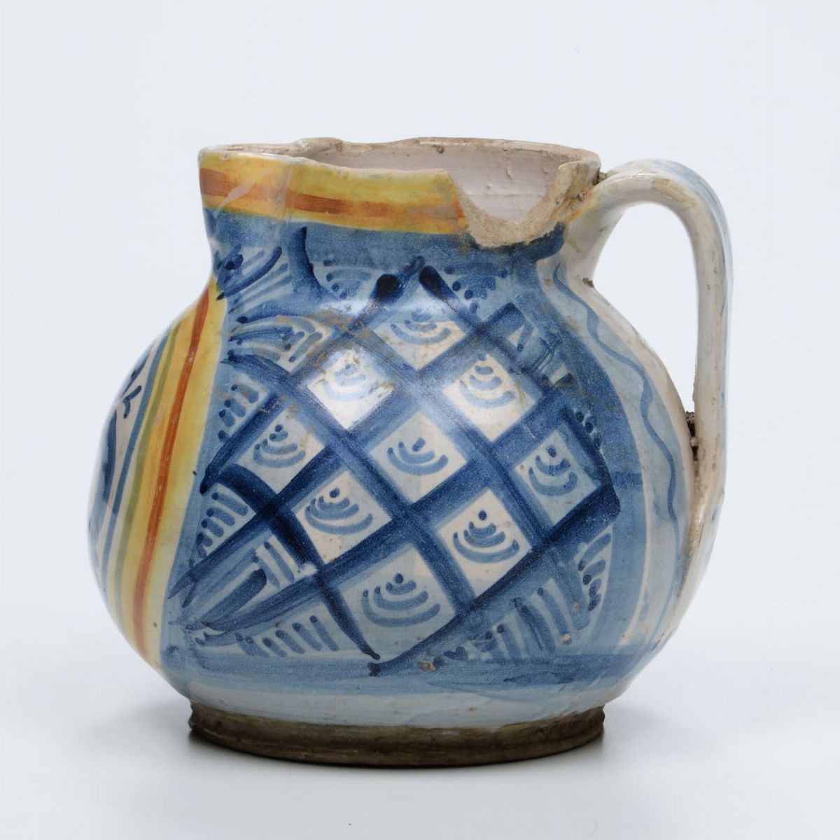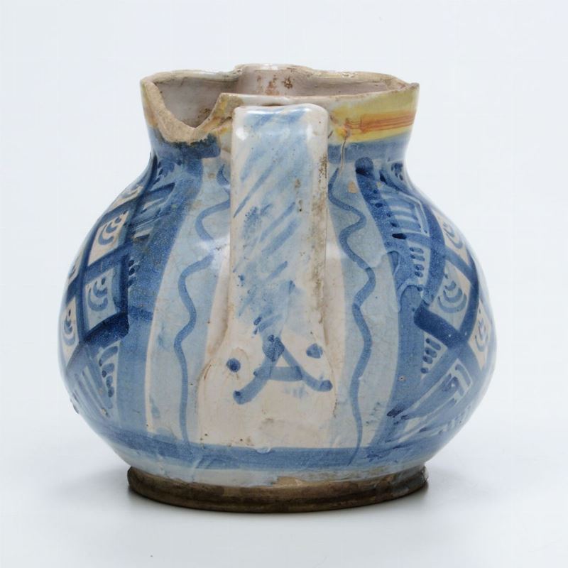 Maiolica. Marca: “.A.” in blu sul manico. Altezza cm 15,3. Grossa sbeccatura all’orlo superiore