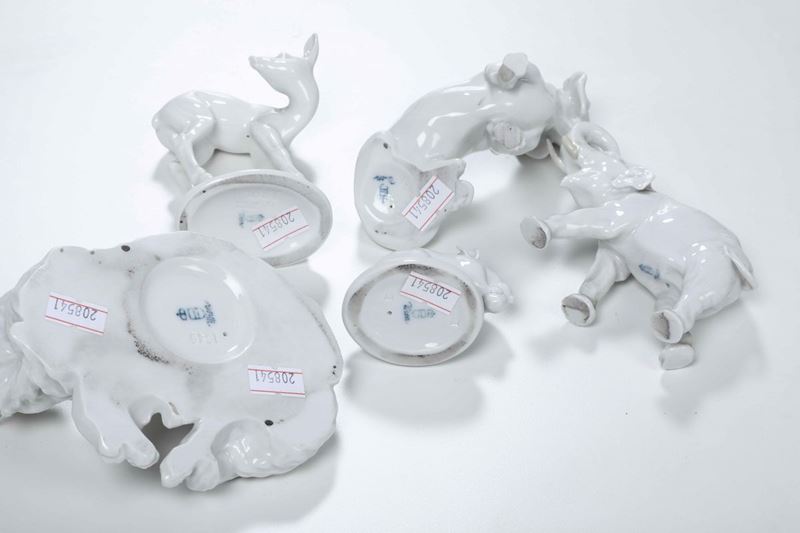 Porcellana bianca. Marca: scudo con corona e “Wien” in blu. Dimensioni: h. min. cm 4,6; h. max. cm 9,7. Buono stato di conservazione; elefante con zanne restaurate di cui una con mancanza; topo con orecchio desto sbeccato