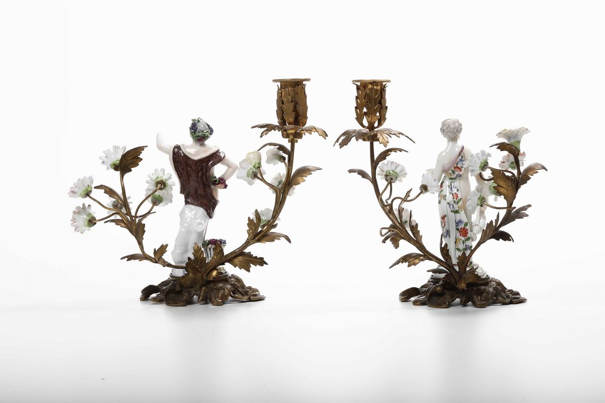 Porcellana e bronzo dorato. Marca: pseudo marca di Meissen con tre trattini incrociati in blu. Altezza massima: cm 21. Conservazione: mano della figura maschile mancante
