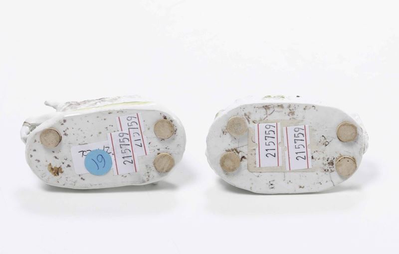 Porcellana. Marca: spade in blu, su un pezzo. Dimensioni: altezza cm 5,5 c.a. Conservazione: buona; un orecchio rifatto e uno con sbeccatura; due zampe anteriori rincollate; minime sbeccature alla vegetazione