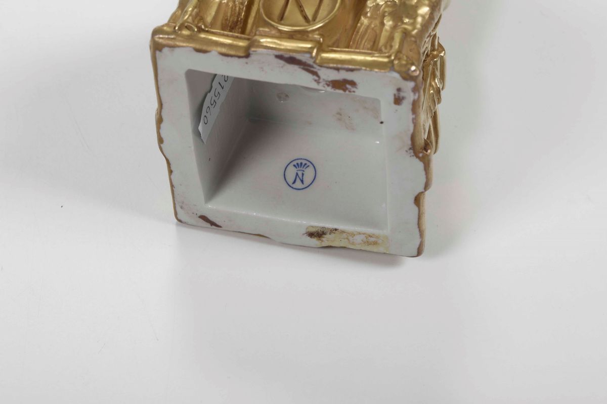 Porcellana bianca e dorata. Marca: N con corona in blu; B Merli inciso. Altezza cm 27 circa. Conservazione: perfetta.