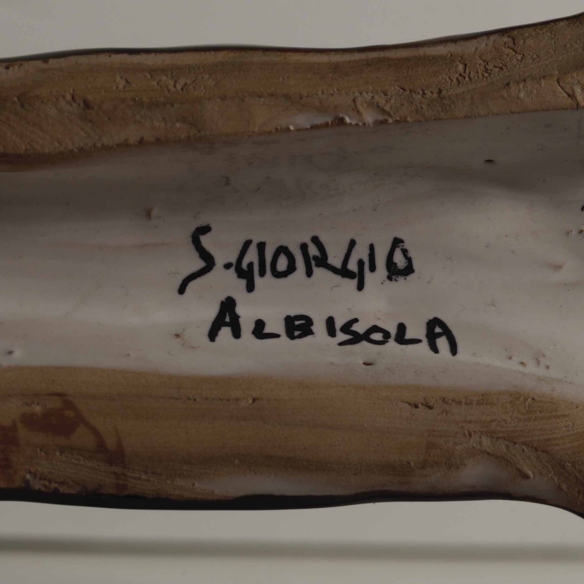 Terracotta smaltata nei colori manganese e verde. Marca: S.Giorgio Albisola 1974; firmato Salino. Altezza cm 36,3 X 25. Minime sbeccature