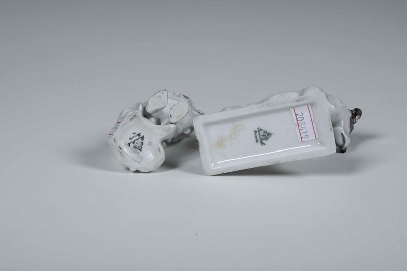 Porcellana policroma. Marca: due rose incrociate con corona e “Rosenthal Bavaria” in verde. Dimensioni: cavalier h. cm 8x6,5x4; terrier h. cm 9x9,5x5. Il cavalier spaniel con rotture alle zampe anteriori restaurate; il fox terrier in ottimo stato