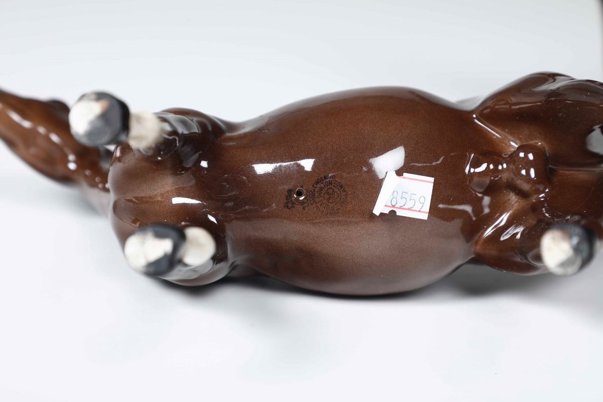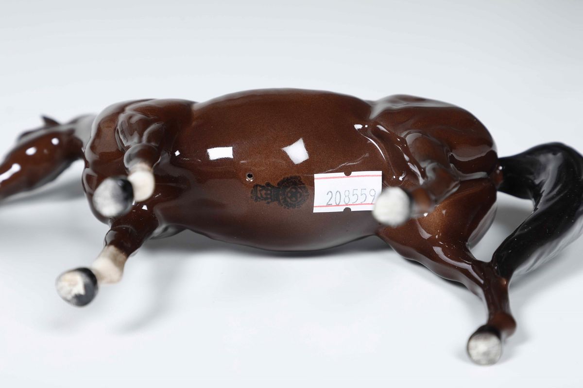 Porcellana policroma. Marca: simbolo della manifattura con corona e leone “Royal Doulton England”, “Made in England”. Dimensioni: h. cm 19,5; h. cm 16. Stato di conservazione: il cavallo più alto ha le orecchie restaurate; l’altro ha un'insignificante sbeccatura alla punta di un orecchio