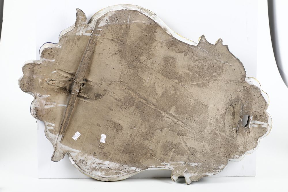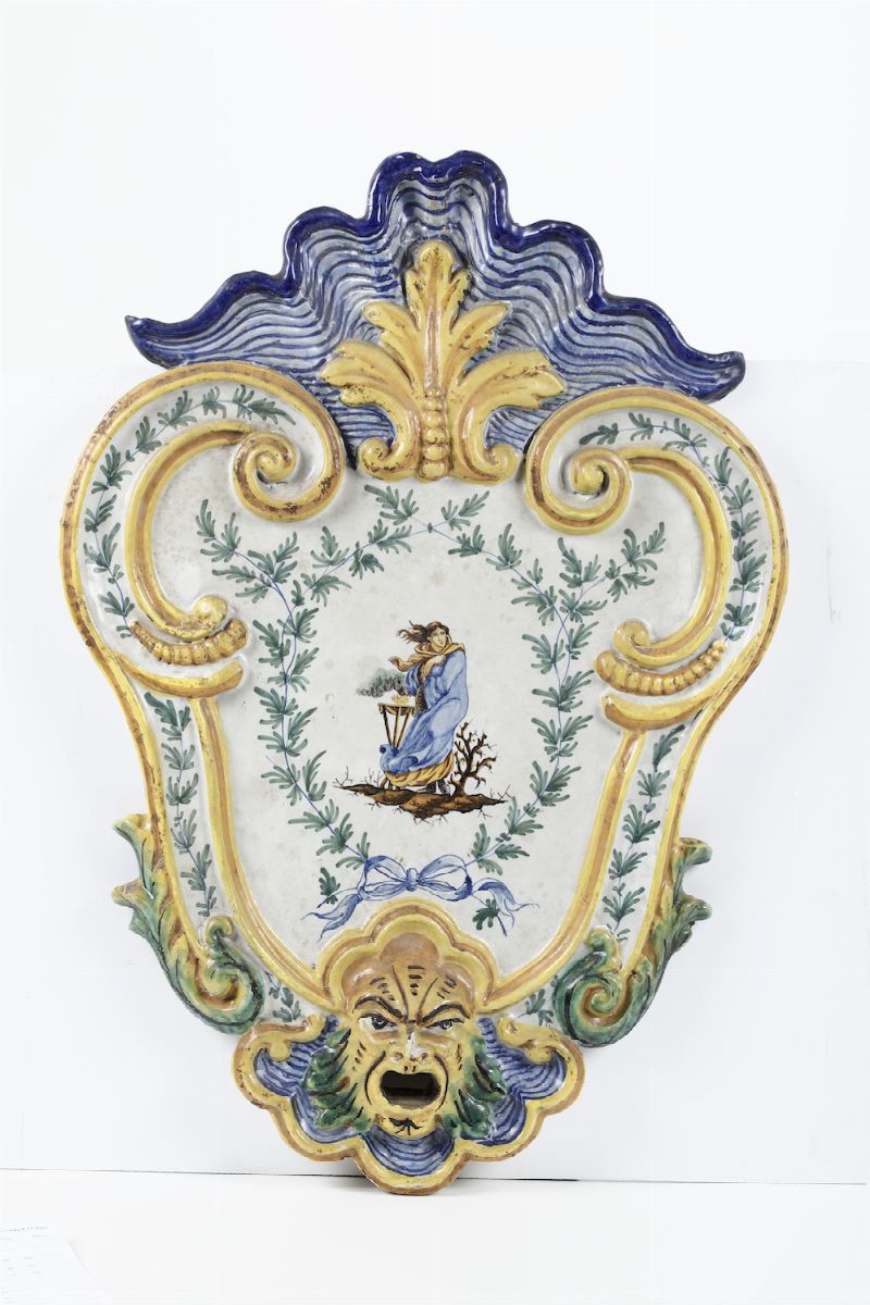 Maiolica. Marca: assente. Dimensioni: cm 65 x 46. Conservazione: un pezzo con qualche minima sbeccatura; l'altro rotto in probabilmente 3-4 frammenti e ricomposto in vecchio restauro, le due rocaille a sinistra e a destra della cimasa restaurate