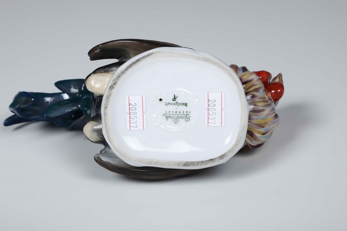 Porcellana policroma. Marca: “Rosenthal” coronata tra due bastoni incrociati, “Germany handgemalt” e “R” in verde. Dimensioni: h. cm 14,8; 20x8,8. Ottimo stato di conservazione