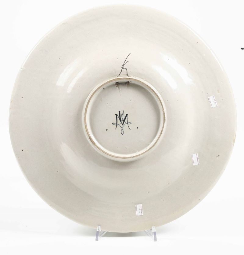 Maiolica. Marca: “UM” intrecciate in blu. Diametro: cm 42,5. Conservazione: ottima; insignificante sbeccatura al bordo