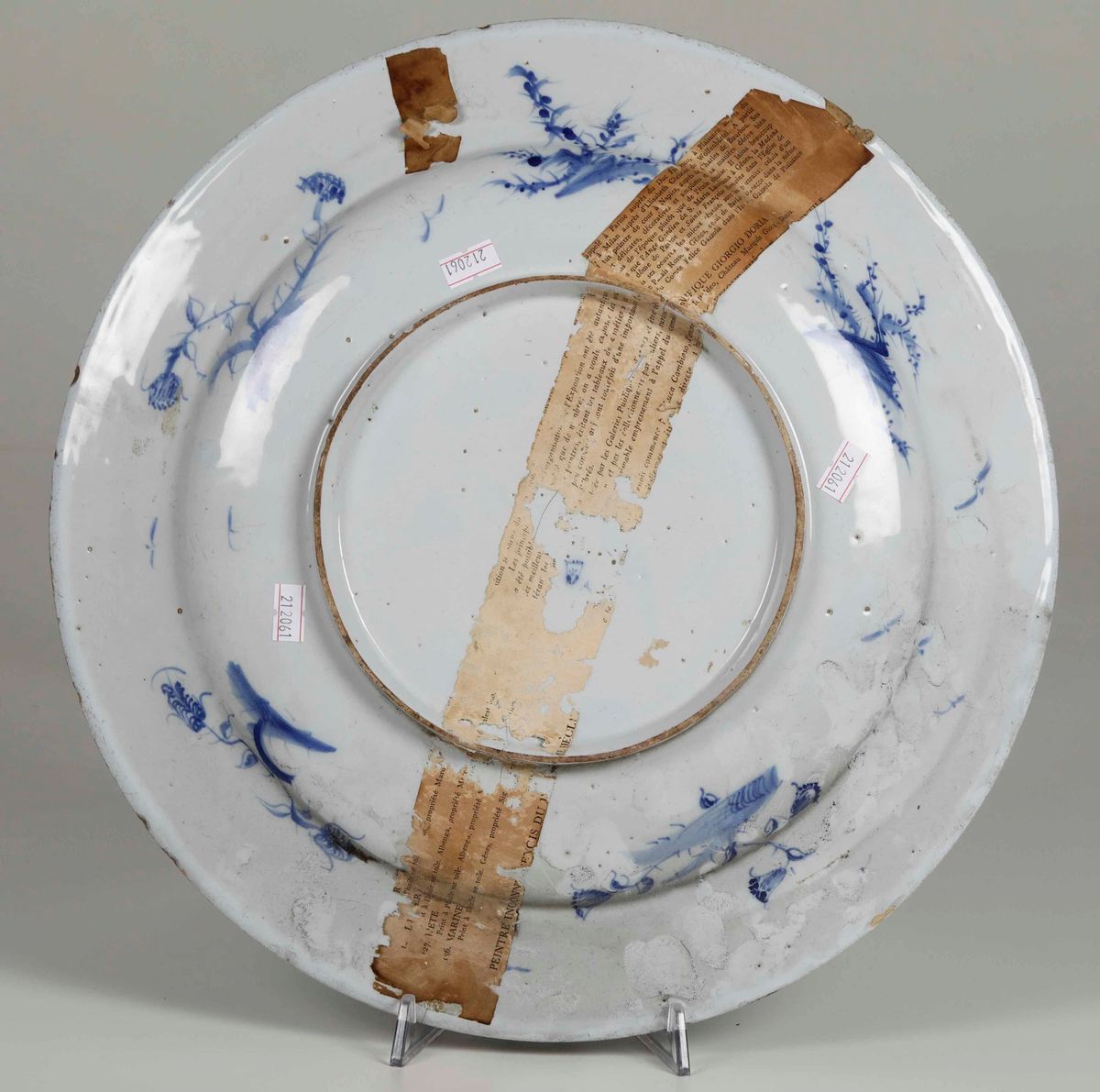 Maiolica in monocromia blu di cobalto. Marca: stemma di Savona e lettere B A in blu. Diametro cm 30,5. Rotto in due pezzi e rincollato; qualche sbeccatura al bordo