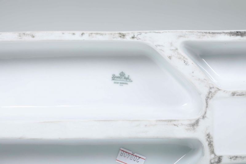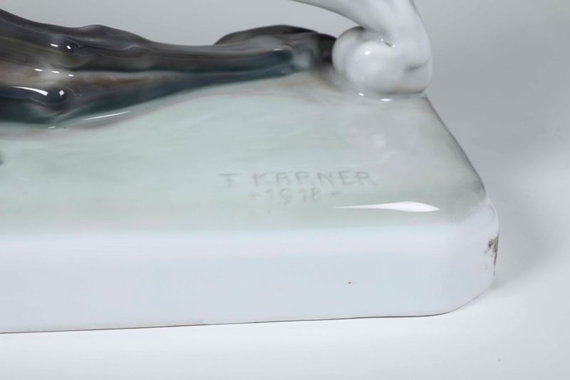 Porcellana policroma. Marca: “Rosenthal Selb - Bavaria” coronata tra due bastoni incrociati e “Germany Kunstabteilung Selb”, in verde; “T. Kärner 1918” impresso. Dimensioni: h. cm 30x63x14. Ottimo stato di conservazione; una felatura di cottura alla base riparata in fabbrica