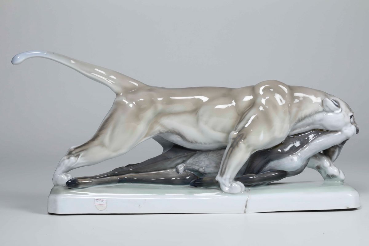 Grande scultura di puma con cervo Germania, Selb (Baviera), Manifattura Rosenthal, XX secolo Modello di Theodor Kärner (1884 [..]