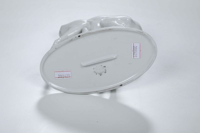 Porcellana bianca. Marca: “Rosenthal” coronata tra due bastoni incrociati e “Germany Kunstabteilung Selb”, in verde; numero “1638” impresso; “R.REMPEL” impresso sulla base. Dimensioni: h. cm 15,7x15,5x8,8. Felatura e sbeccatura alla zampa sinistra anteriore della cerbiatta adulta