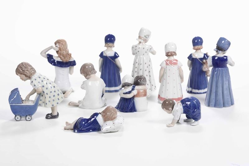 Gruppo di 11 figurine Danimarca, manifattura Royale Copenaghen e Bing & Grøndahl, seconda metà del XX secolo