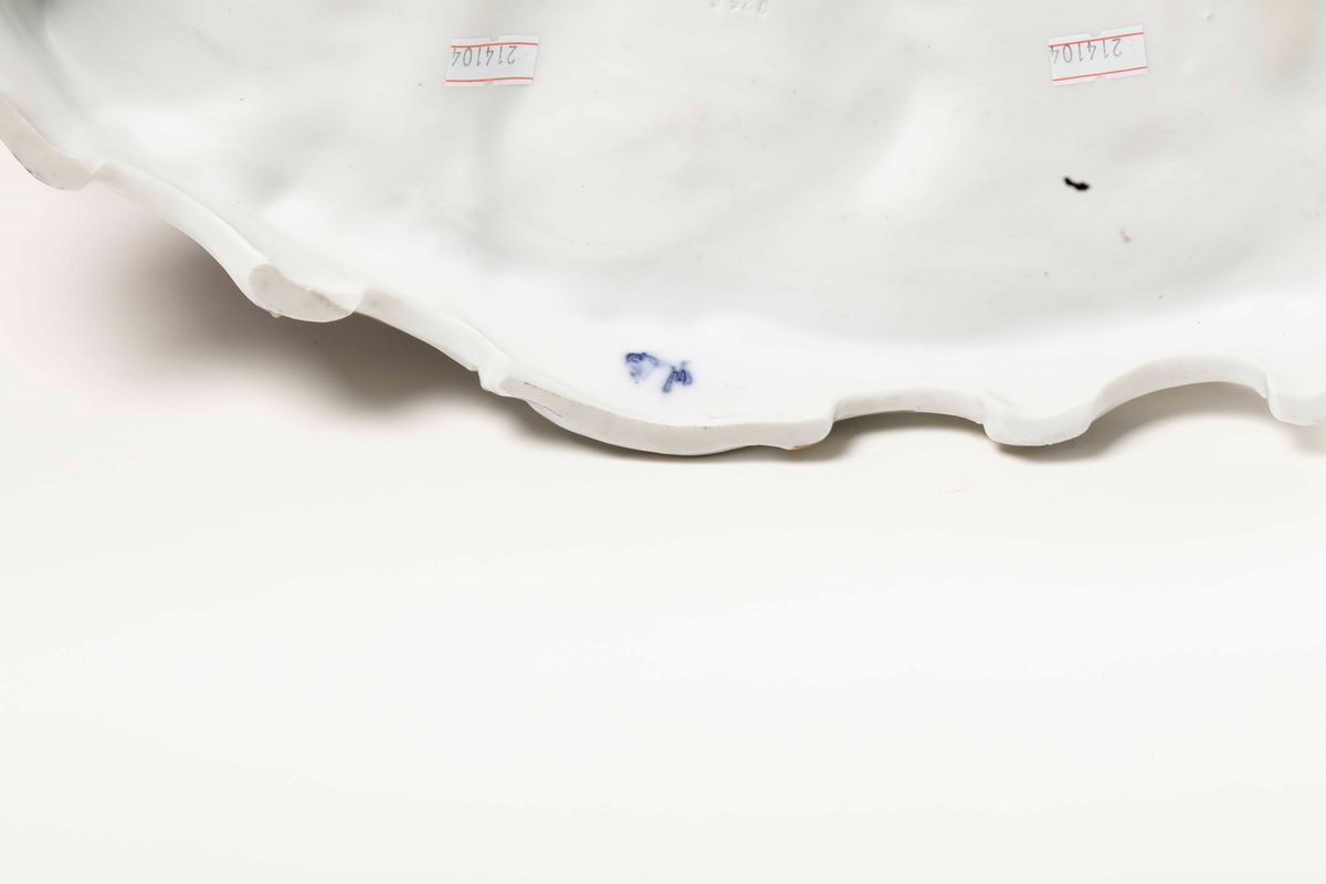 Porcellana. Marca: simbolo della Manifattura in blu, altezza cm 26,5 x 37 x 19,5. Conservazione: cinque dita mancanti, qualche minima sbeccatura al tulle, alle punte della giacca e alla fascia di un giovane