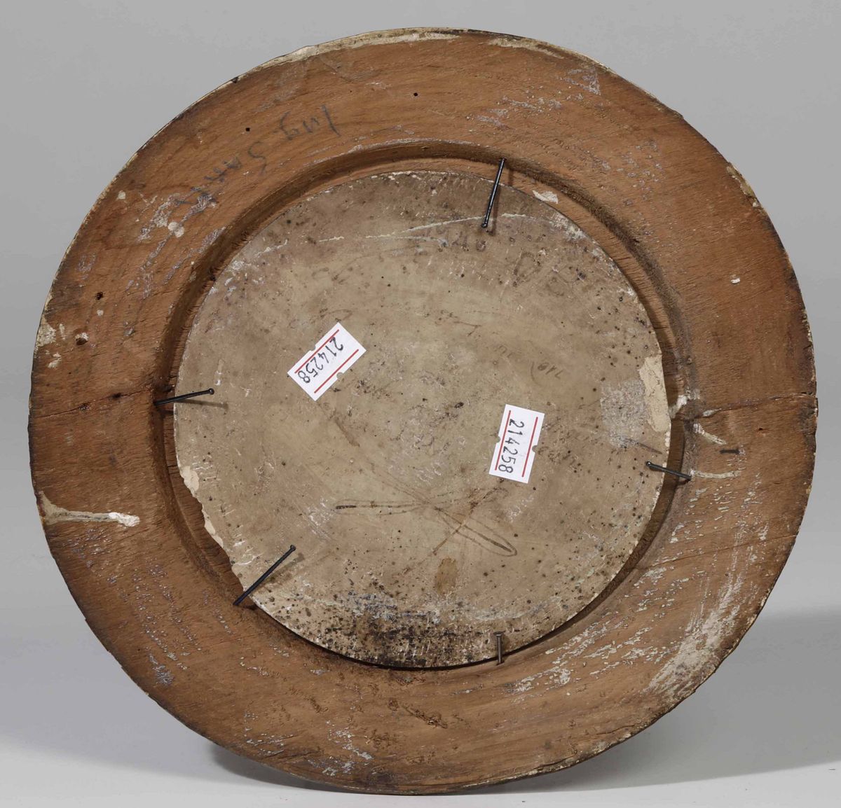 Maiolica. Diametro cm 15. Ampia sbeccatura al bordo alle ore 4. Cornice in legno (diametro cm 23,6)