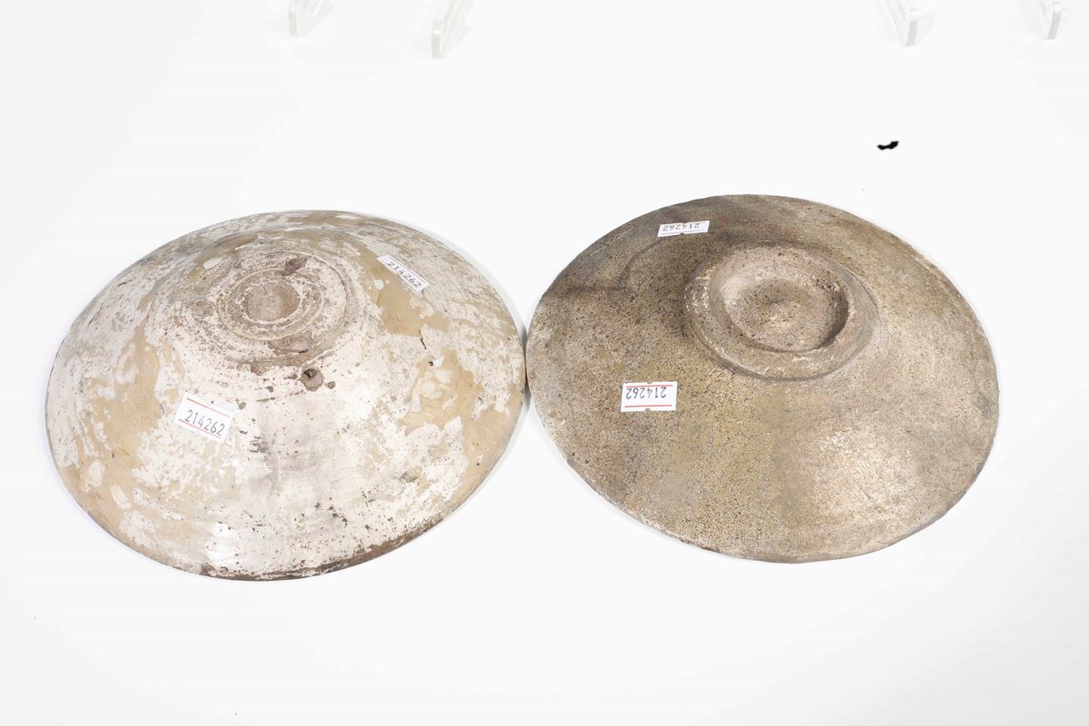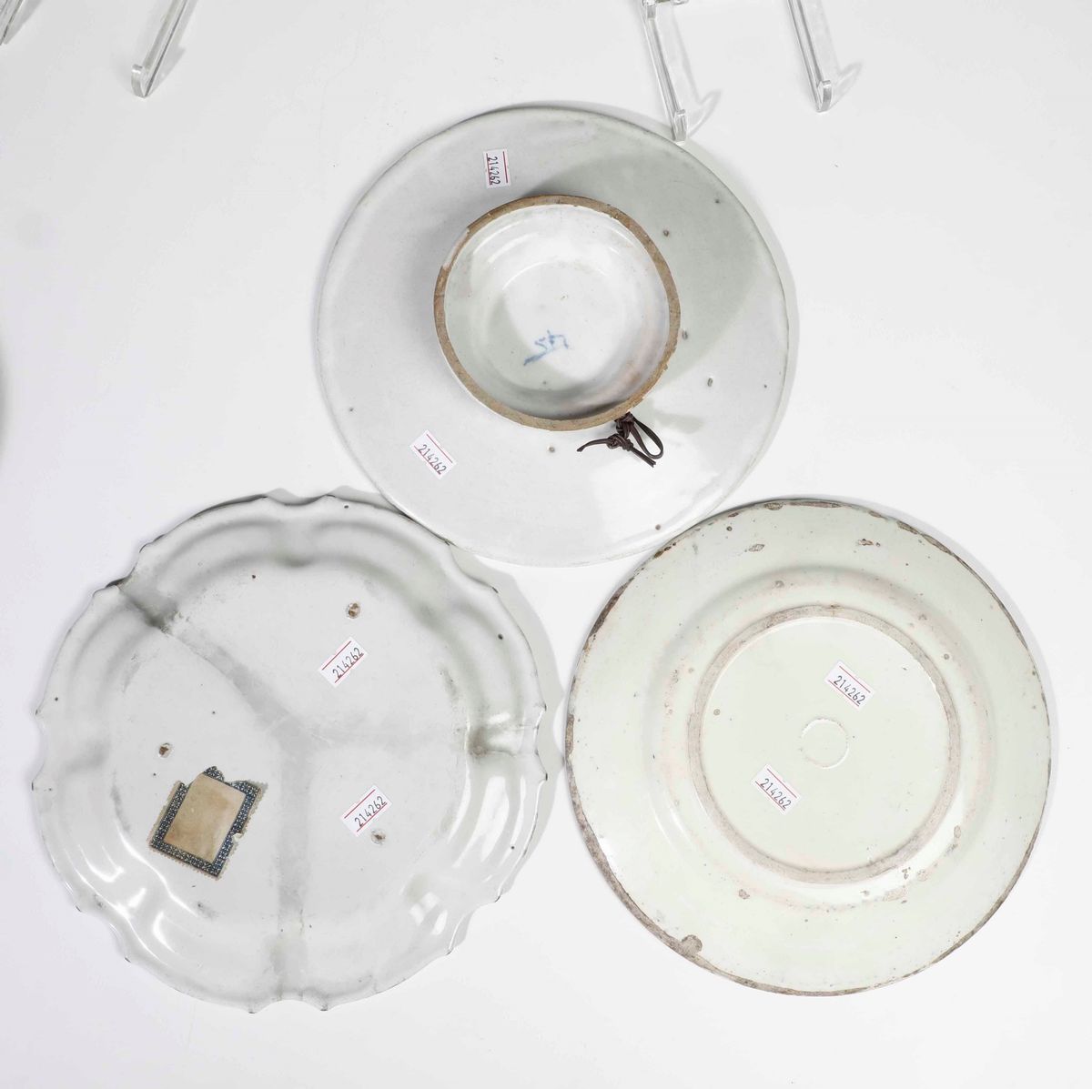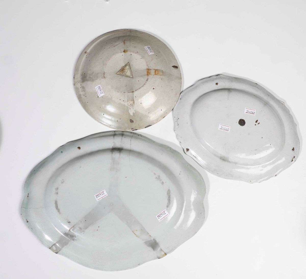 Due piatti ovali Cerreto (un pezzo cm 34x26; l'altro cm 26x20,5). Un piatto probabilmente Savona (diametro 21,5; rottura al bordo restaurata). Una sottocoppa Savona (marca Fortezza. Altezza cm 5; diametro cm 23; piccole sbeccature al bordo). Un piatto Spagna XVIII secolo (diametro cm 19; restauri). Un piatti tipologia ferrarese (diametro cm 19,5; rotto in due frammenti e ricomposto). Un piatto tipologia popolare XIX secolo (diametro cm 23; sbeccature)