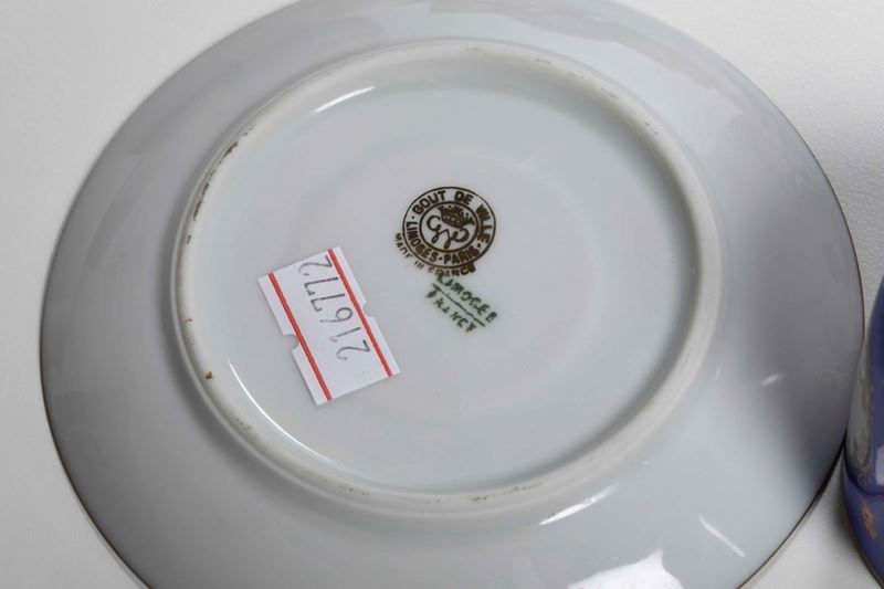 Porcellana policroma. Marca: Limoges France in verde; simbolo del rivenditore parigino in oro. Conservazione: ottima.