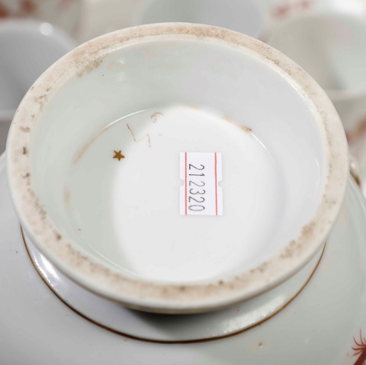 1 caffettiera (marca stella in oro; altezza cm 24; felatura alla base del manico); 12 tazze e 12 piattini di diverso modello e diverse epoche (altezza tazza cm 7 ca; diametro piattini cm 12,5 ca.; 2 piattini con sbeccature; 2 tazze con piccolissime sbeccature al bordo superiore)