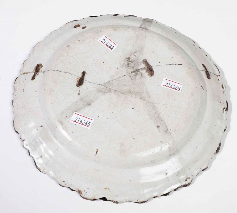 Maiolica. Marca assente. Diametro cm 23,7. Conservazione: rotto in due frammenti e ricomposto in vecchio restauro con agrafe