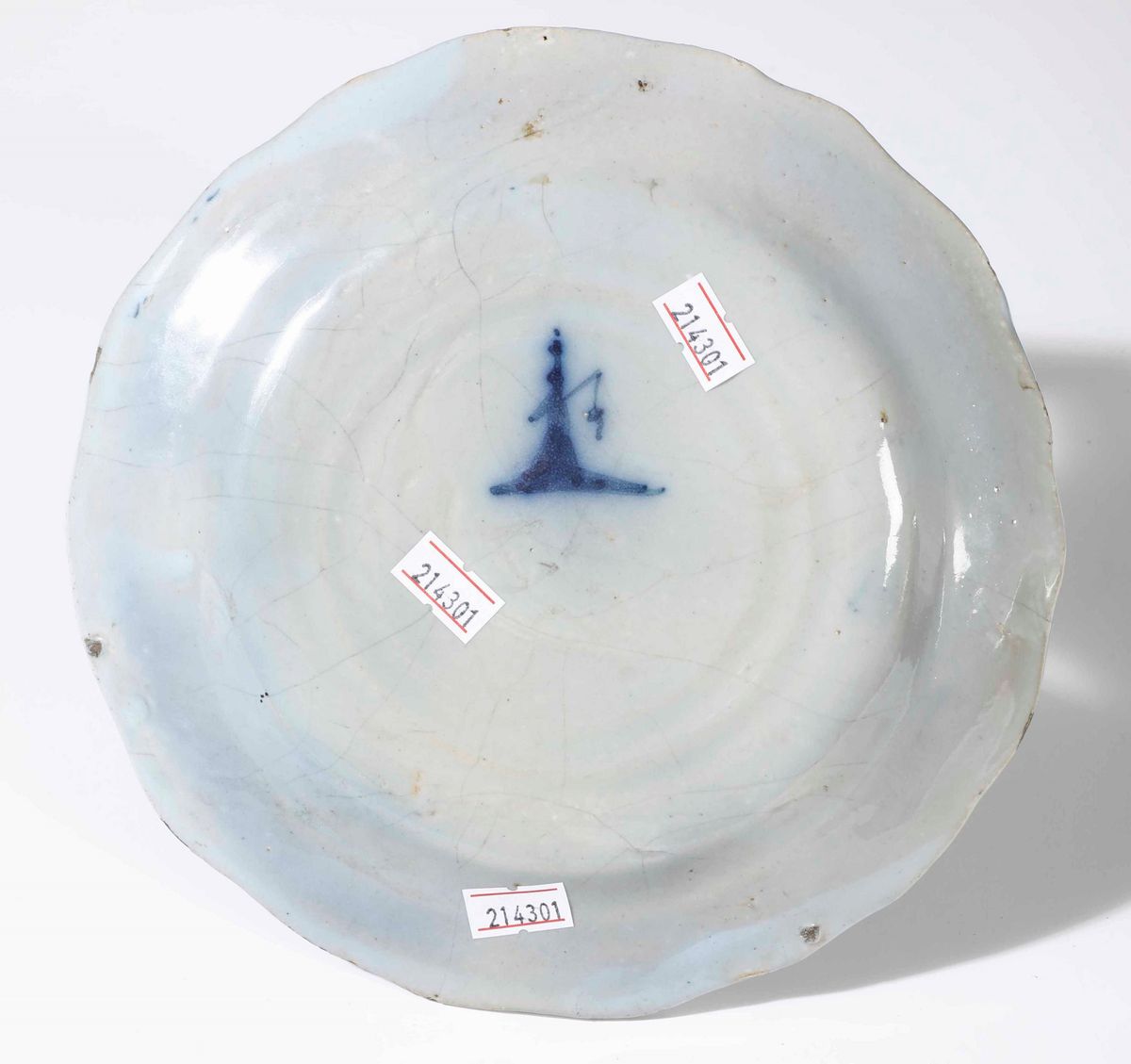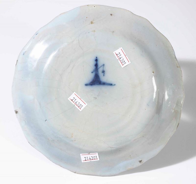 Maiolica in monocromia blu di cobalto e manganese. Marca: lanterna in blu. Diametro cm 21. Conservazione: craquelures
