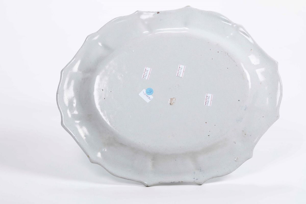 Maiolica. Marca: assente. Dimensioni: cm 32x39. Conservazione: ottima; qualche insignificante sbeccatura al bordo