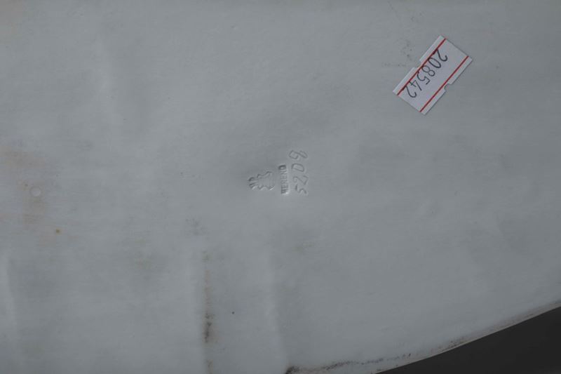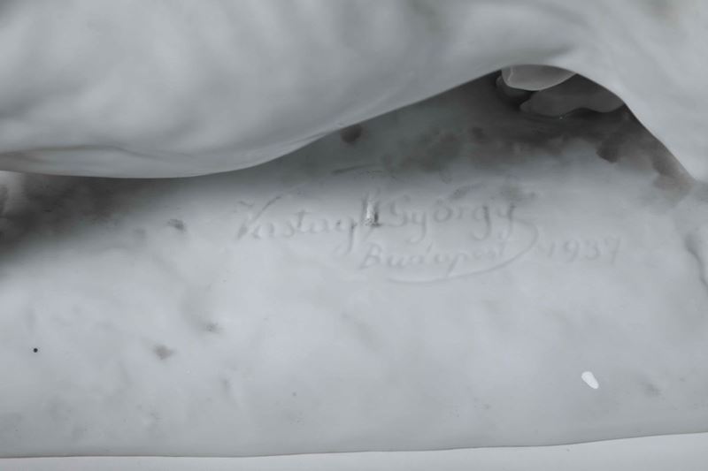 Porcellana bianca. Marca: stemma con “Herend” impressi; numero “5208” inciso; firma “Vastagh György Budapest 1937” incisa sullo zoccolo. Dimensioni: h. cm 22,7; 50,5x14. Felatura alla zampa anteriore sinistra