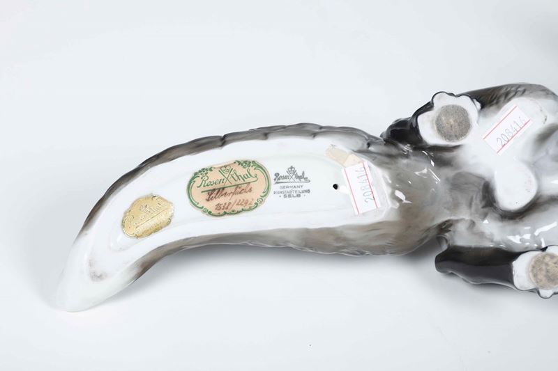 Porcellana policroma. Marca: “Rosenthal” coronata tra due bastoni incrociati e “Germany Kunstabteilung Selb”, in grigio; etichette cartacee. Dimensioni: h. cm 20x40,7x11. Ottimo stato di conservazione