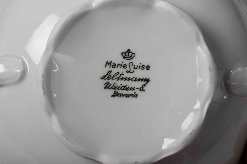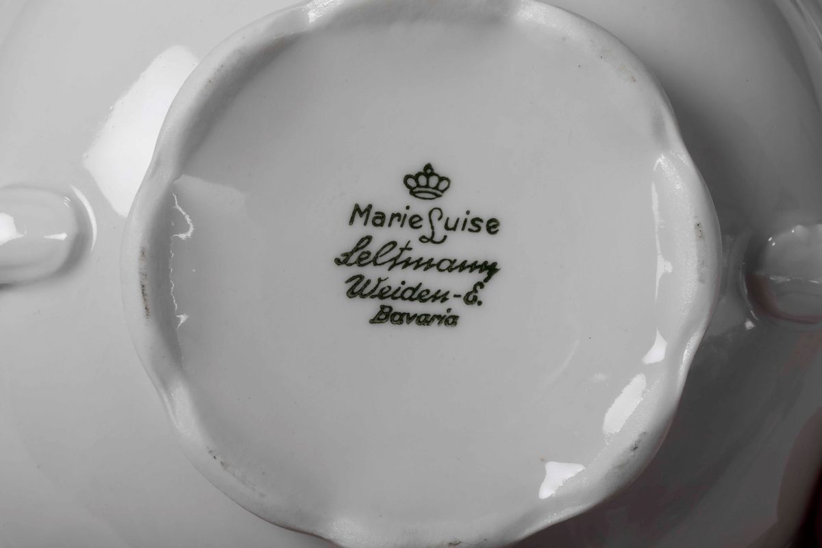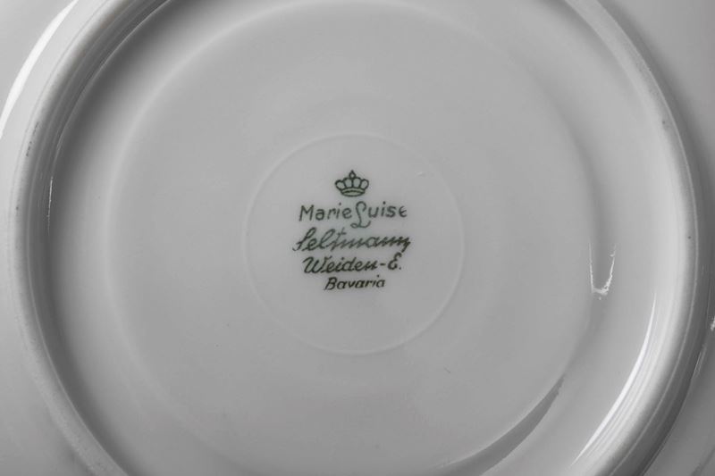 Porcellana bianca. Marca: ”Marie Luise Seltmann”, “Weiden-E.” e “Bavaria” in verde. Altezza tazza cm 5,5; diametro piattino cm 17. Ottimo stato di conservazione