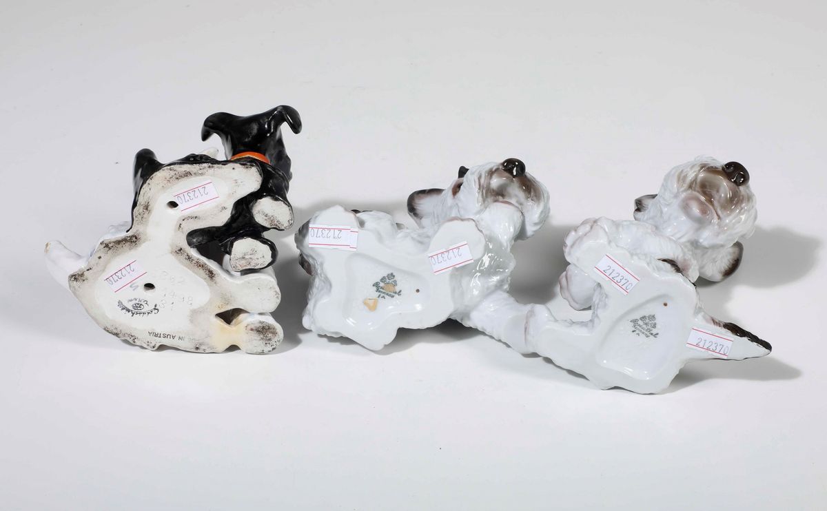 Tre figurine di Schnauzer Germania manifattura Rosenthal e Vienna manifattura Goldscheider, prima metà del XX secolo