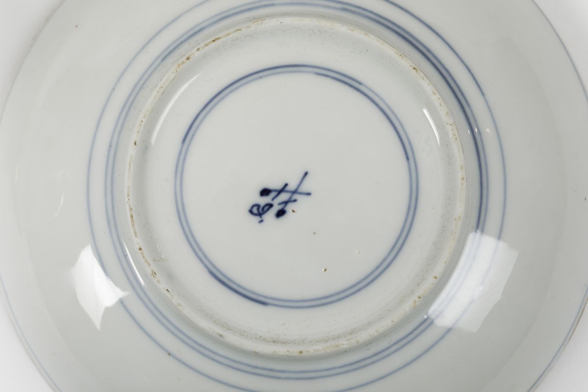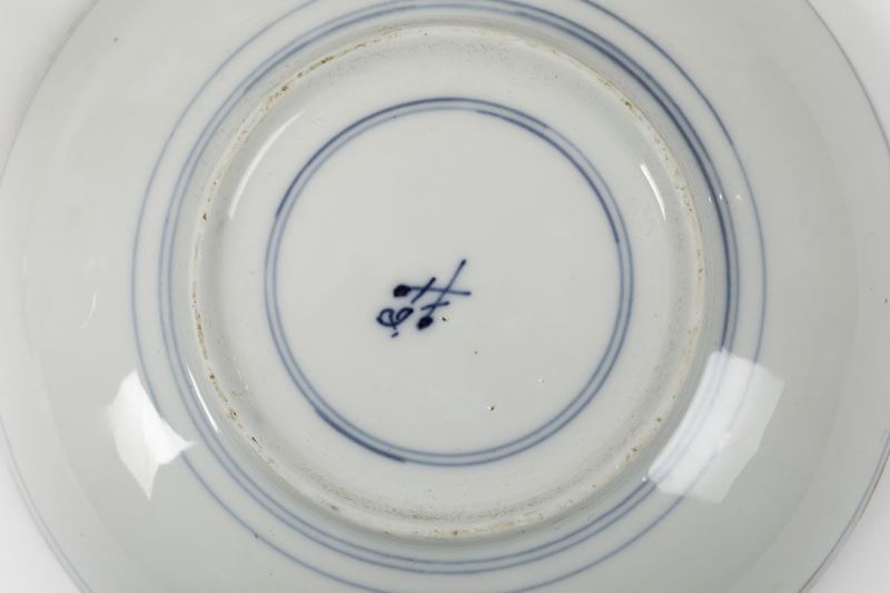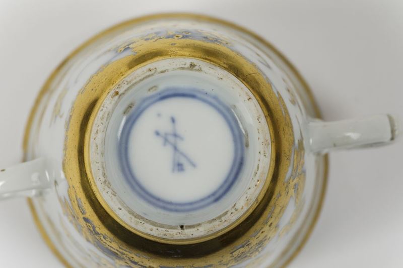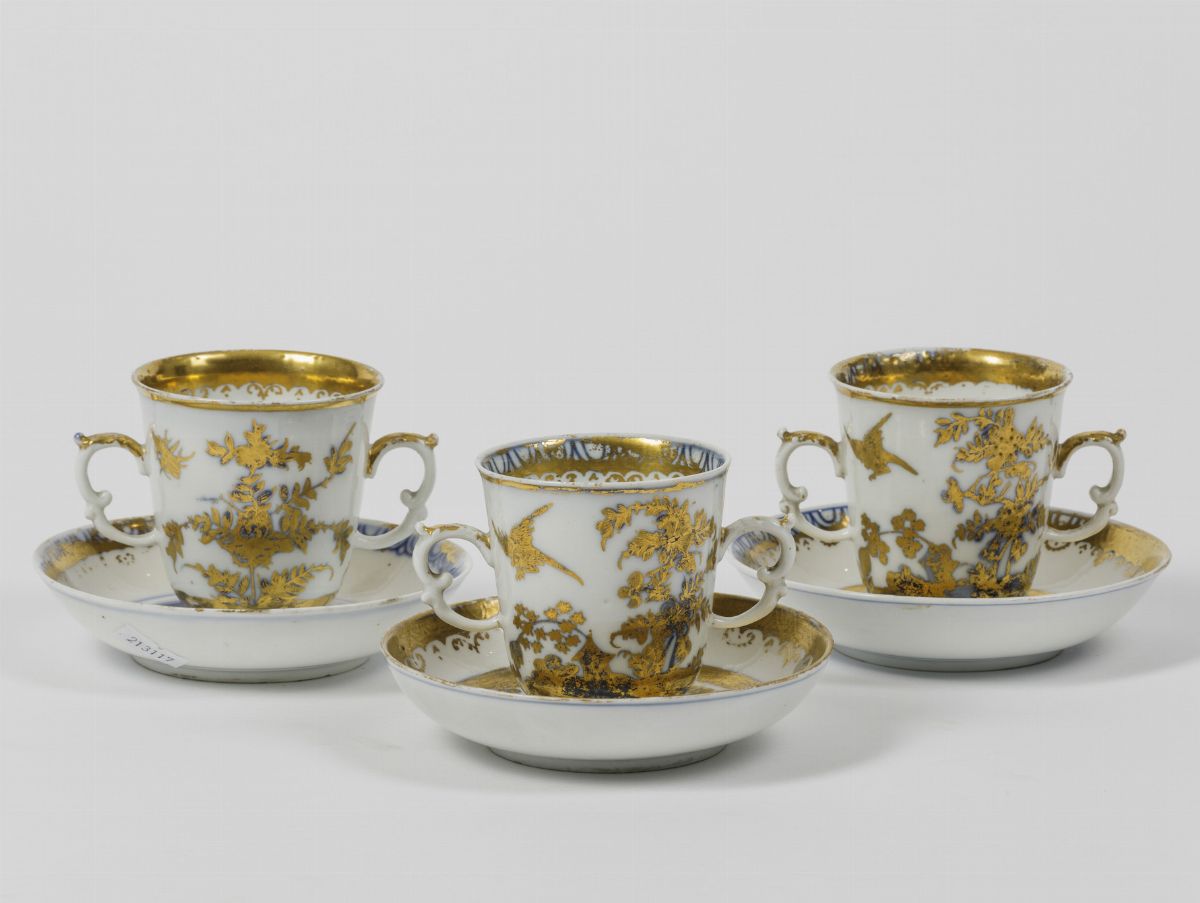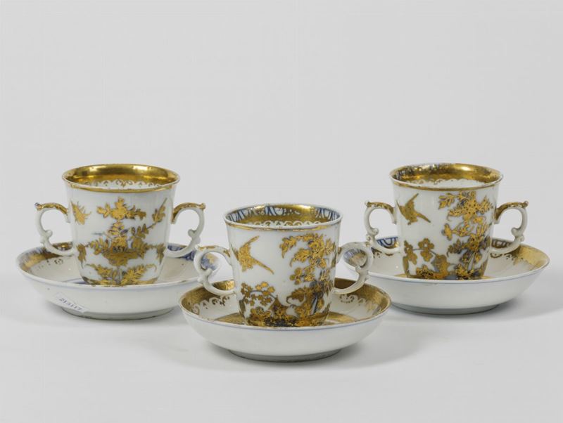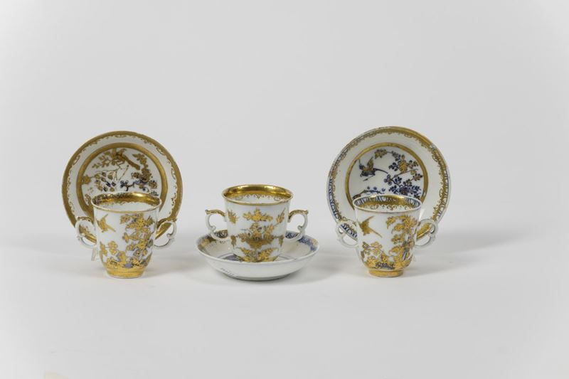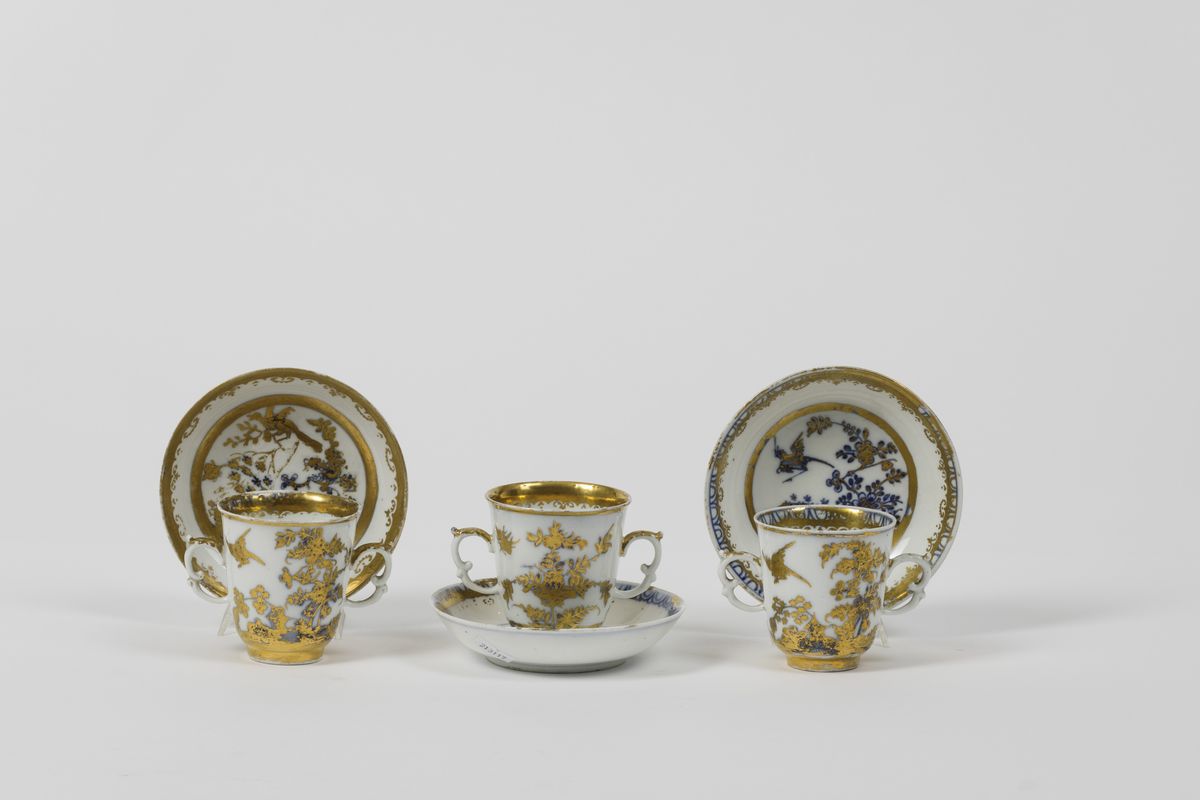 Tazze da cioccolata con piattini decorati in oro “radiert” ad Augsburg nella bottega di Abraham Seuter su porcellana uscita dalla manifattura di Meissen con motivi in blu a gran fuoco