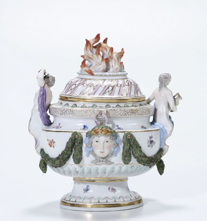 Il vaso con il coperchio dalla presa a fiamma ha due manici modellati a tutto tondo con figurine che si rifanno alla mitologia. Il recto e il verso ospitano due mascheroni con divinità classiche e festoni con foglie di alloro