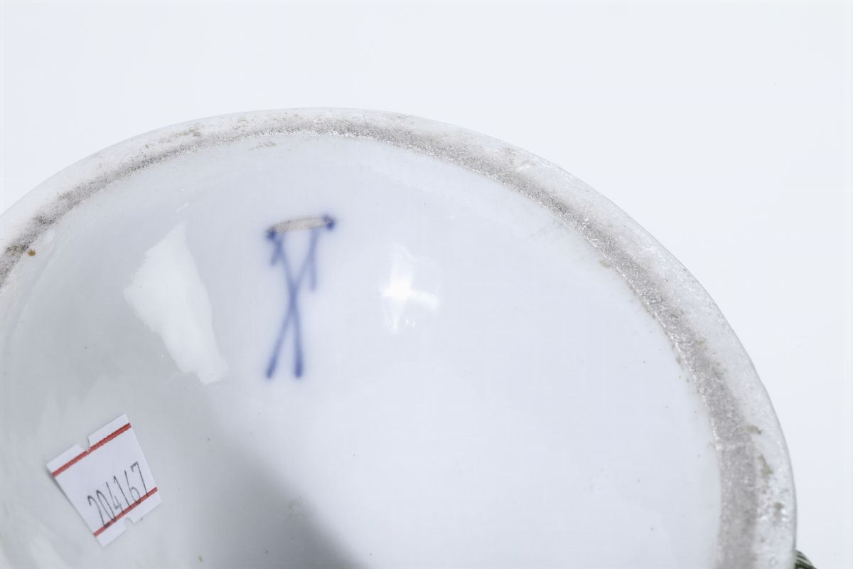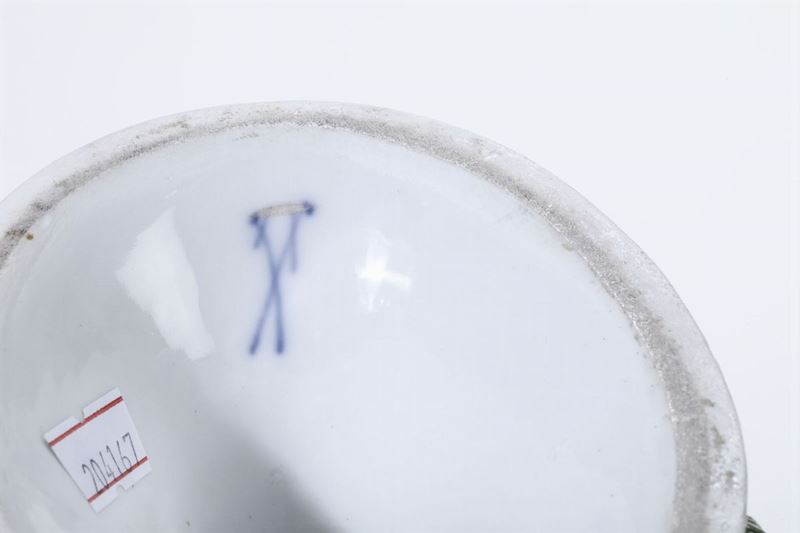 Porcellana. Marca: spade in blu. Altezza cm 26,3; 23,5 x 16,5. Restauri all’anello che tiene il mascherone con la testa di Mercurio; rotture e restauri al collo della brocca; insignificanti riprese al festone