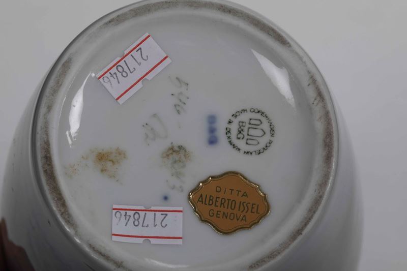 Porcellana. Marca: simbolo della manifattura con Copenhagen Porcelain made in Denmark in verde; B&G in blu; numeri diversi. Altezza cm: 24,6. Conservazione: piccola sbeccatura al bordo superiore