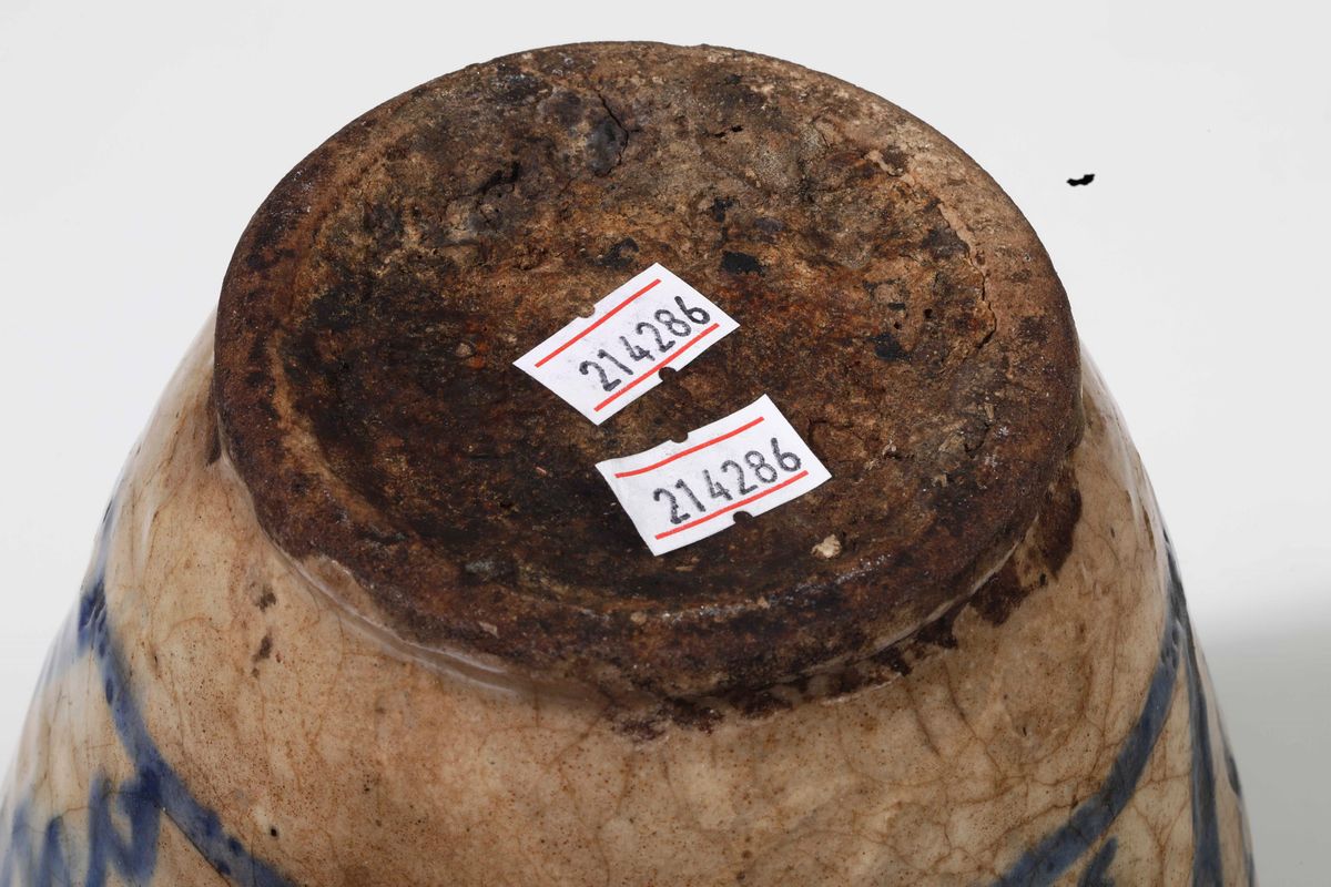 Ceramica silicea. Altezza cm 16,7. Conservazione: ottimo stato; due sbeccature nella fascia centrale ricomposti in vecchio restauro; minima sbeccatura la bordo superiore