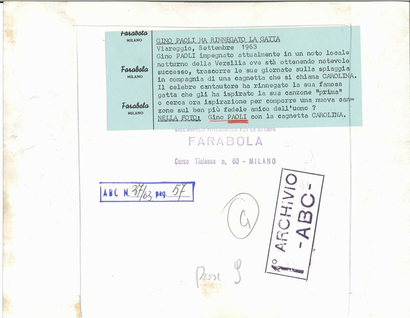 Timbro al retro dell’agenzia fotografica per la stampa Farabola, servizio di Lamberto Londi