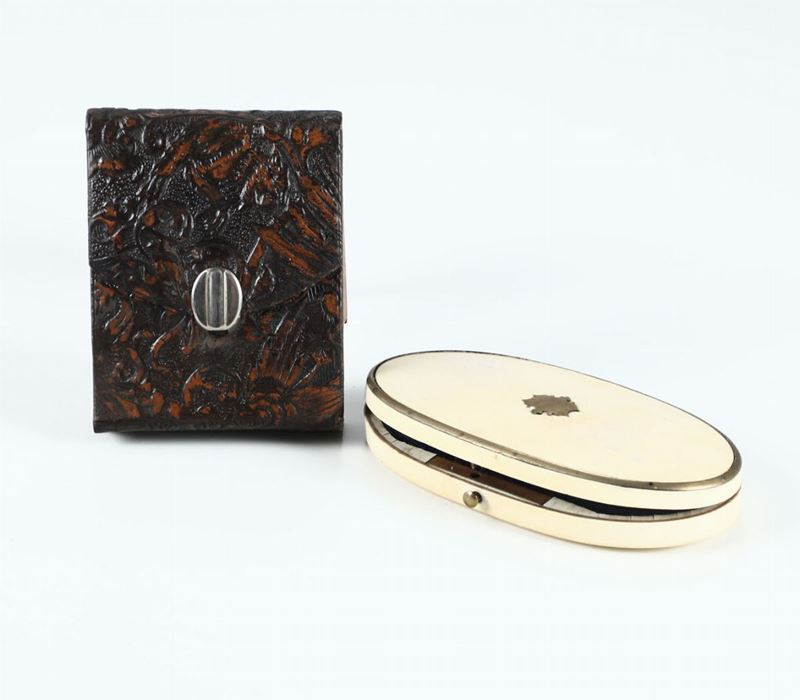 Lotto comprendente due necessaire da cucito di cui uno in argento entro scatola ovale in avorio e ottone e uno in custodia in cuoio lavorato a motivi vegetali e chiusura in argento, XIX secolo