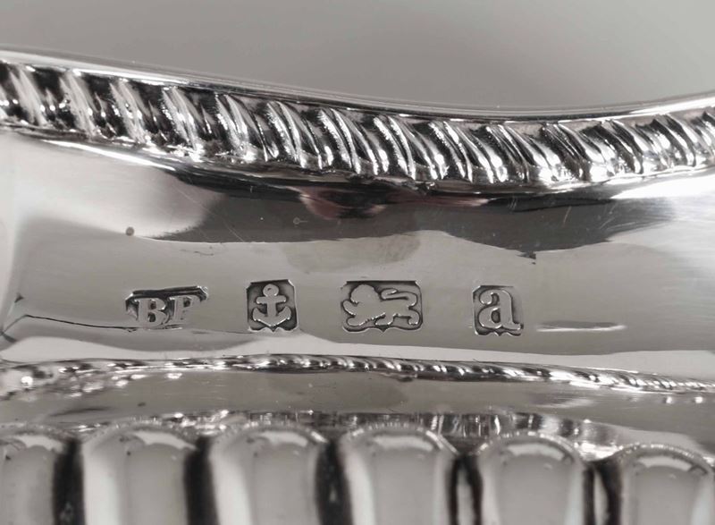 Servizio da tè in argento fuso e cesellato, manico in legno ebanizzato. Marchi della città di Birmingham per l’anno 1900 e dell’argentiere B.P. (?) non identificato