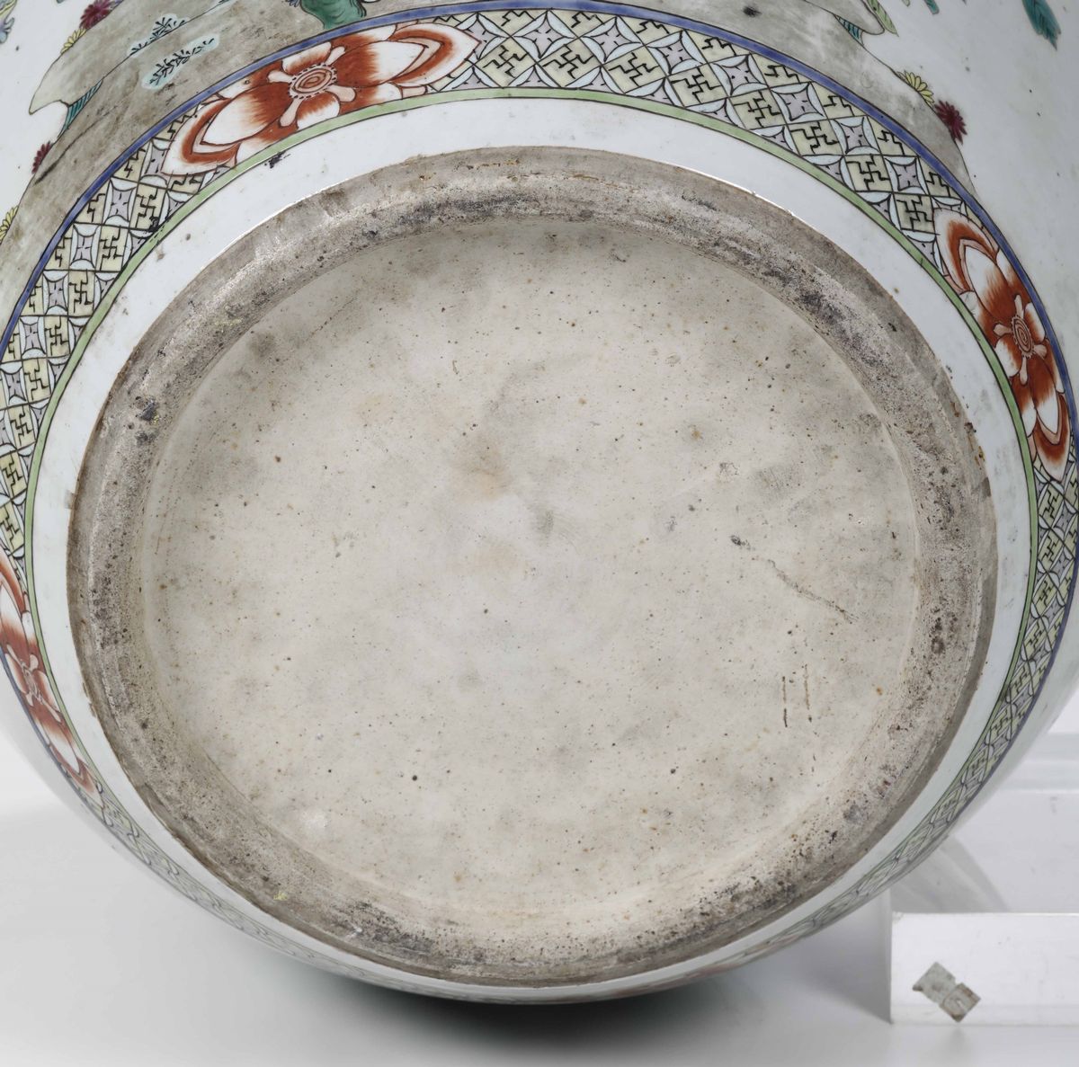 Cachepot in porcellana a smalti policromi con raffigurazione di fiori e volatile, Cina XX secolo